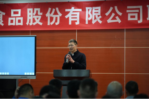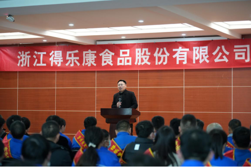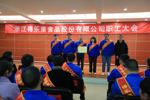 2023年2月6日,浙江得乐康食品股份有限公司在办公楼五楼会议室召开年度职工大会,除本部全体员工外,江苏、杭州两家子公司中级以上管理人员均远程参加了会议。本次会议由副经理朱昌民主持,大会共四项议程:经营管理班子成员发言、年度表彰、部门负责人表态发言、董事长讲话。