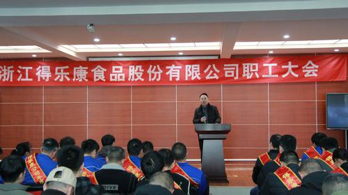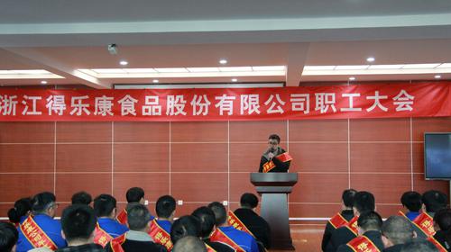 2025年2月6日,浙江得乐康食品股份有限公司在行政楼五楼会议室召开年度职工大会,除总部员工外,江苏子公司中层以上人员和杭州、湖北子公司人员均远程参加了会议。 本次会议由副经理朱昌民主持,大会共四项议程:公司年度经营及工作情况汇报、部门负责人交流发言、年度表彰及颁奖、董事长讲话。